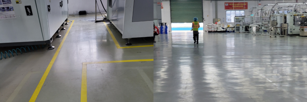 • Xả hóa chất từ máy chà xuống sàn thi công